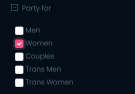 You are able to select multiple options. Please note that the selection is a "and" selection. This means that when you select for example the "men" and "women" groups, you will get results that feature parties for men and for women, not combined.
