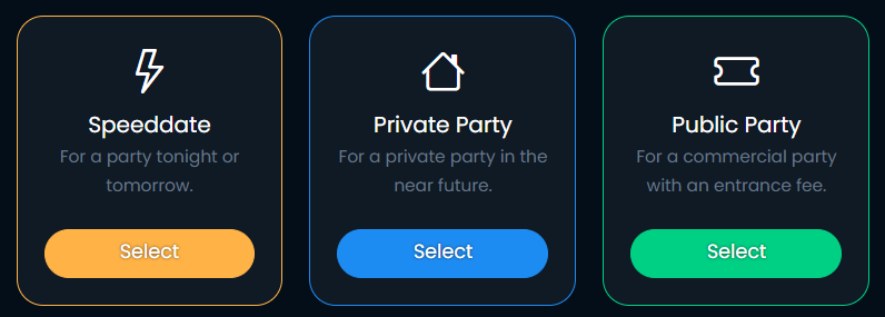 We offer three types of parties. Below you will find an explanation of each type and when to use them for the best results (more replies and better matches).